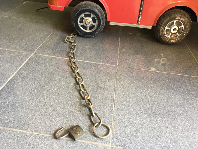 Một đầu sợi dây xích Tùng dùng khoá xích vào chiếc xe ô tô đồ chơi, đầu còn lại xích vào cổ vợ.