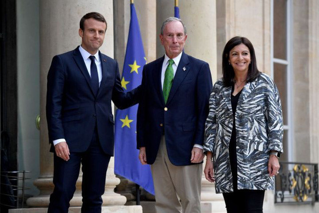 Tổng thống Pháp Emmanuel Macron hoan nghênh cựu thị trưởng thành phố New York, Michael Bloomberg bên cạnh thị trưởng Paris, Anne Hidalgo trước cuộc họp của họ tại Cung điện Elysee tại Paris ngày 2/6 vừa qua. (Nguồn: Christophe Petit Tesson-AFP/Getty Image