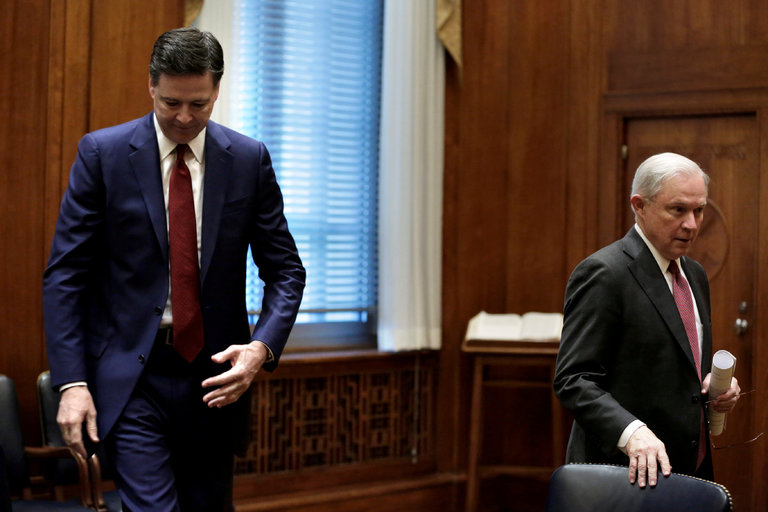 Cựu giám đốc FBI James Comey với bộ trưởng Tư pháp Jeff Sessions trong một cuộc họp tại bộ Tư pháp vào tháng 2 (Nguồn: Reuters)