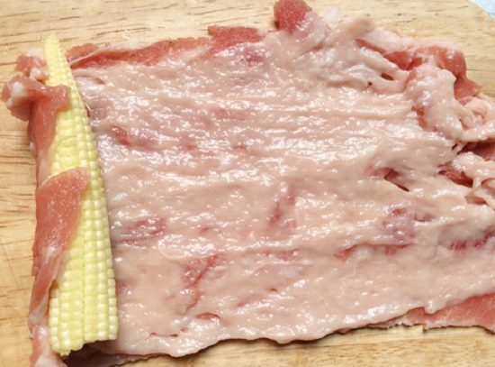 - Bước 2: Bạn trải miếng thịt bò đã ướp ra, dùng thìa quết một lớp giò sống mỏng lên miếng thịt bò. Sau đó bạn đặt ngô non lên trên rồi cuộn tròn lại.