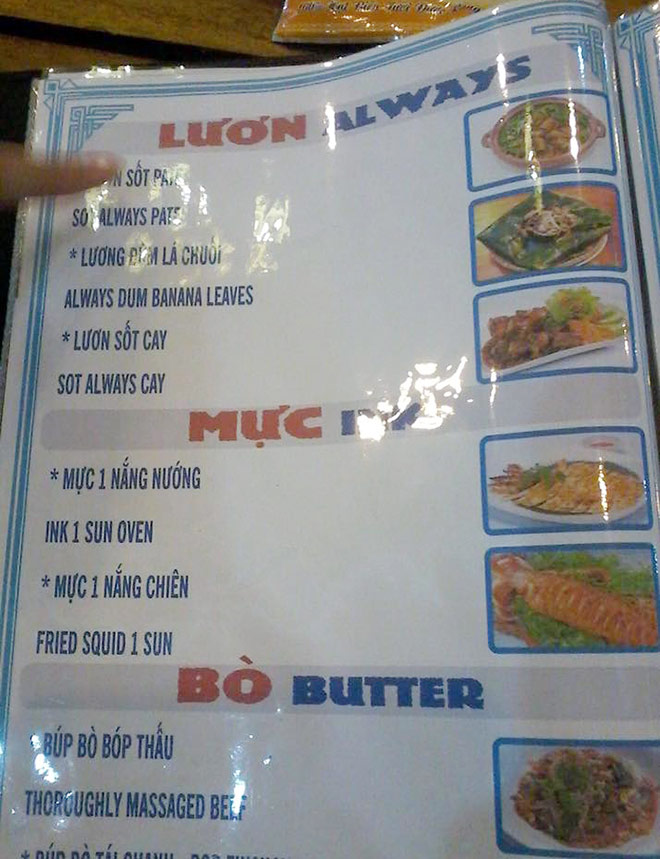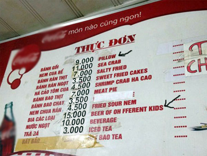 Biển hiệu của một cửa hàng ăn uống với các món ăn được ghi bằng cả tiếng Việt lẫn tiếng Anh thế nhưng khi nhìn kỹ người xem mới ngã ngửa bởi tất cả đều được dịch sai và hoàn toàn khác xa nghĩa gốc của nó.