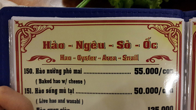 Những thực đơn ở VC không mắc lỗi này thì mắc lỗi khác. Lỗi chính tả nhỏ cũng làm thực khách cười "đứt ruột". Lại thêm khoản có thêm tên tiếng Anh của món ăn lại còn nực cười nữa. Những thực đơn được ghi bằng cả tiếng Việt và tiếng anh bị sai chính tả, ngữ pháp một cách “khó đỡ” khiến những thực khách khi gọi món có nguy cơ "đứt ruột" vì buồn cười.