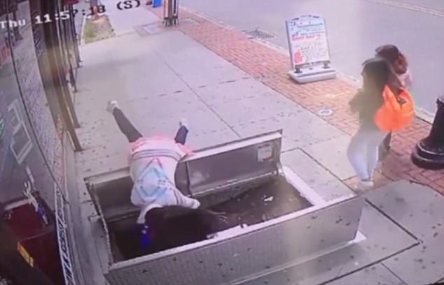 Chỉ trong giây lát, người phụ nữ này đã đâm thẳng vào cánh cửa đang mở, loạng choạng rồi ngã xuống hố trước sự kinh ngạc của những người đi đường.