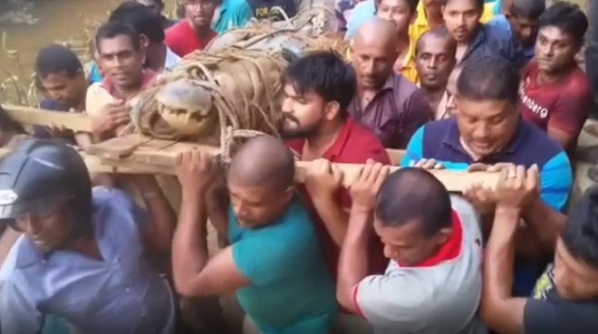 Người dân ở một ngôi làng Sri Lanka đã cùng nhau khiêng một con cá sấu khổng lồ để đưa nó về khu bảo tồn, BBC đưa tin. Được biết con cá sấu dạt vào làng sau trận ngập lụt gần đây.