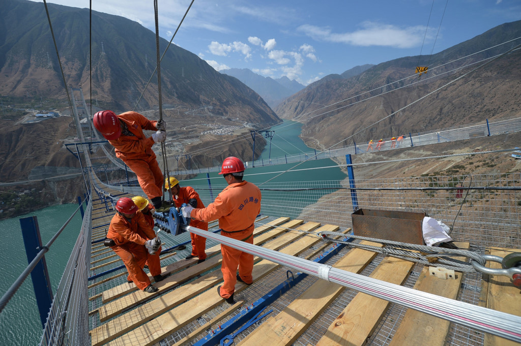 Trung Quốc xây dựng hàng nghìn cây cầu lớn nhỏ trên khắp đất nước nhằm chứng minh khả năng phát triển cơ sở hạ tầng. Ảnh chụp cầu Bắc Bàn Giang bắc qua khe núi nối hai tỉnh Vân Nam và Quý Châu. Để xây dựng cây cầu cao nhất thế giới này, các công nhân đã mất 3 năm xây dựng và hoàn thành với chi phí lên tới hơn 140 triệu USD. Ảnh: Reuters.