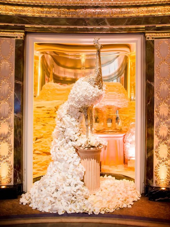 1 trong 6 con công làm bằng hoa lan đặt ở sảnh đón khách. Đám cưới này tổ chức tại Anh