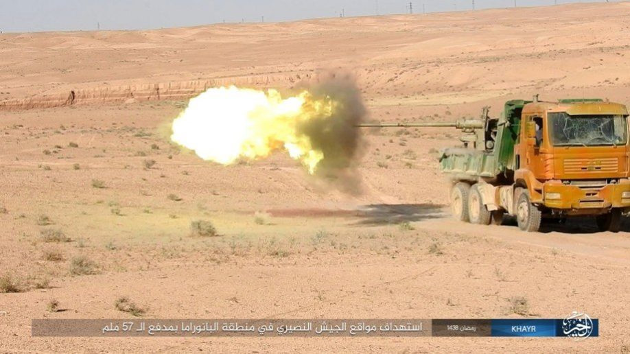 Trang Amaq đăng tải chùm ảnh thánh chiến, cho thấy một số lượng các tay súng IS tấn công các chiến tuyến quân đội Syria quanh vòng xoay Panorama trên tuyến đường M7 nối liền với thành phố Deir Ezzor.