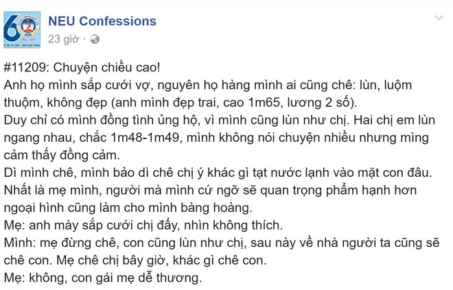 Mới đây, trên diễn đàn NEU Confessions xuất hiện câu chuyện của một cô gái giấu tên. Bạn gái kể cho dân mạng nghe câu chuyện kén dâu của nhà anh họ mình. Anh ấy cao 1m65 được nhận xét là "đẹp trai", "lương 2 con số". Trong khi, chị dâu họ tương lai của cô bạn cao 1m48 thì bị nhận xét là "lùn", "luộm thuộm", "không đẹp". Cái nhìn đầy phân biệt và bất công của gia đình anh họ dành cho cô gái có chiều cao khiếm tốn khiến người kể câu chuyện cảm thấy bức xúc, đồng cảm.
