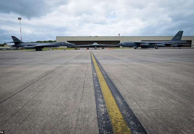 Ba máy bay B-1B Lancer (trái), B-2 Spirit (giữa) và B-52 (phải) ở căn cứ RAF Fairford, Gloucestershire. Ảnh: Daily Mail