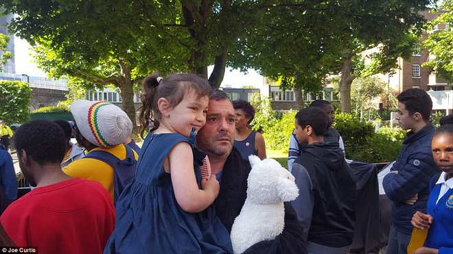 Đôi mắt rơm rớm nước mắt của người đàn ông sống ở căn hộ tầng 7 của ṭa tháp, bên cạnh cô con gái ngây thơ chưa hề biết chuyện kinh hoàng ǵ đă xảy ra.