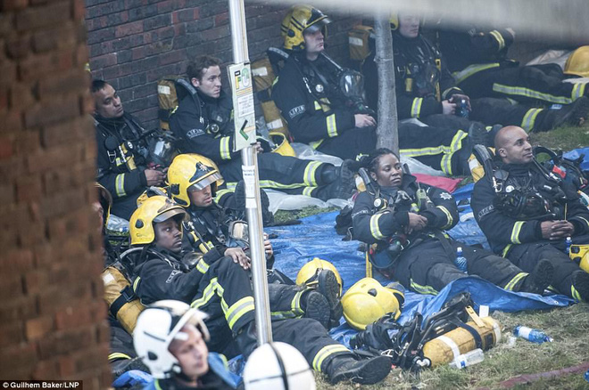 Lính cứu hỏa với vẻ mặt thất thần đang ngồi nghỉ ngơi sau khi làm nhiệm vụ.