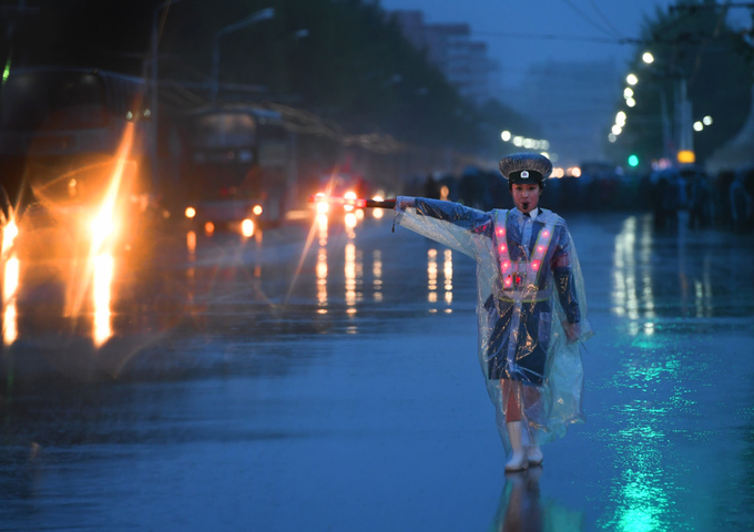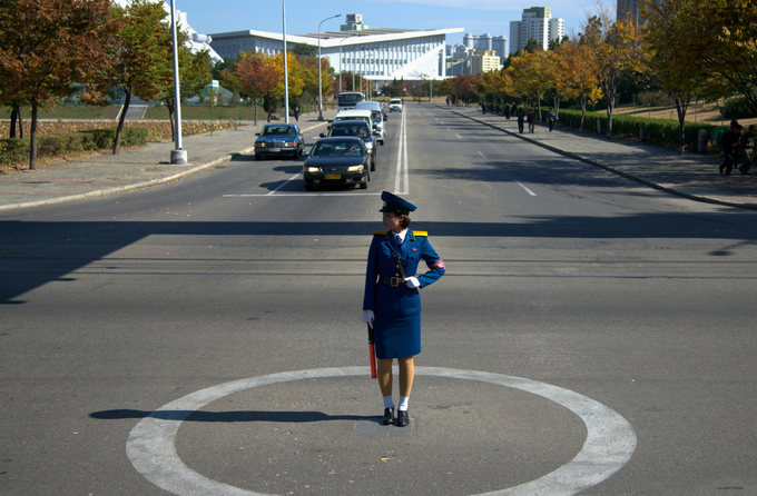 Simon Cockerell, giám đốc điều hành đại lý Koryo Tours, nhận định những cô gái giao thông là chủ đề phổ biến trong các bộ ảnh mà du khách chụp tại Bình Nhưỡng. "Những cô gái vừa điều khiển giao thông, vừa thắp sáng những con phố thủ đô. Tôi cho rằng không có du khách nào tới đây lại không một bức ảnh về họ. Tôi không hề quá lời nếu gọi họ là biểu tượng của Bình Nhưỡng". Ảnh: Ray Cunningham.