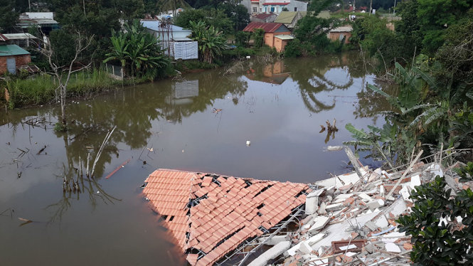 Hiện trường toàn bộ 2 căn nhà bị chìm xuống ao hồ - Ảnh: NHẬT LỆ