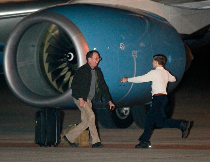Ông Jeffrey Edward Fowle vui mừng gặp lại con trai tại sân bay quân sự ở Ohio, Mỹ, sau khi được Triều Tiên trả tự do tháng 10/2014. Ông bị bắt vì để lại một quyển kinh thánh tại khách sạn nơi ông lưu trú ở Bình Nhưỡng mà theo Triều Tiên là hành vi "trái với mục đích du lịch". Trong một cuộc phỏng vấn, ông gửi lời xin lỗi đến cả hai chính phủ Mỹ và Triều Tiên vì đã gây phiền phức ngoại giao giữa hai nước. Ảnh: Dayton Daily News.
