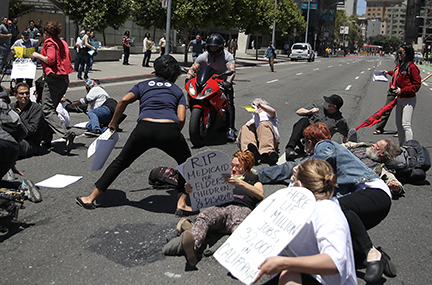 Một thanh niên lực lưỡng đang cố t́nh lái xe bừa qua để cán những người biểu t́nh đang chặn một con đường ở thành phố San Francisco ngày thứ Tư vừa qua. Thanh niên này bênh vực chính phủ Trump, trong khi những người... nằm biểu t́nh th́ không muốn chính phủ thay thế chương tŕnh Obamacare. Một số chính khách Dân Chủ tại California đang vận động cho SB 562, một dự luật bảo hiểm dành cho hết mọi người. Thế nhưng vào chiều thứ Sáu, chủ tịch Hạ Viện cũng thuộc đảng Dân Chủ đă quyết định gác lại dự luật v́ cho rằng nó c̣n quá nhiều thiếu sót. (Justin Sullivan/ Getty Images)