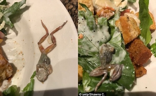 Chị Shawna C phát hiện con ếch chết trên đĩa salad. Nữ thực khách phải trả tiền đồ uống và không nhận được bồi thường. Chị kể lại về trải nghiệm kinh hoàng của mình khi ăn tối tại nhà hàng West Covina, California, Mỹ và vẫn ám ảnh với con ếch chết trên đĩa salad.