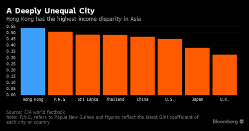 Song tiền lương không theo kịp đà tăng chi phí, và hàng trăm ngàn dân Hồng Kông khó lòng trang trải. Hệ số Gini - thước đo chung của sự bất bình đẳng - là một trong những số liệu có thể nêu bật tình trạng tại Hồng Kông. Kết quả bằng 0 của hệ số cho thấy sự bình đẳng tuyệt đối, còn 1 thì thể hiện điều ngược lại. Hệ số Gini của Hồng Kông là 0,539, cao nhất kể từ khi dữ liệu loại này được ghi nhận kể từ thập niên 1970. Bất bình đẳng ở đây nghiêm trọng nhất châu Á, lớn hơn cả những nơi như Brazil và Papua New Guinea.
