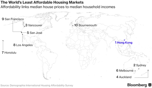 Cuộc tranh luận về giàu - nghèo ở Hồng Kông thường đi vòng về một chữ: đất. Nhà ở tại Hồng Kông đắt nhất thế giới, theo viện chính sách nhà ở Demographia. Giá nhà so với thu nhập trung bình vượt xa những đô thị như Sydney, London và San Francisco. Giá cả tăng gần 400% kể từ khi đợt suy thoái bất động sản kết thúc cách đây 14 năm.