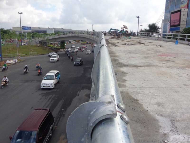 Trên mặt cầu, nơi mũi tàu ngã ba rẽ của hai nhánh vào ga quốc nội và ga quốc tế công nhân đang hoàn thiện hệ thống lan can, rào chắn...
