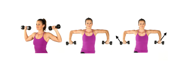 Bước 1: 2 tay cầm tạ , giơ lên ở vị trí thấp hơn vai.