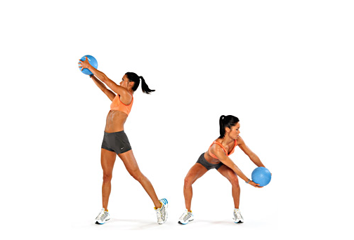 Bước 1: 2 tay ôm bóng hoặc ôm 1 quả tạ tay , chân rộng bằng vai , bước chân trái sang 1 bước , kiễng chân trái , 2 tay giơ quả bóng lên cao đồng thời vặn mình sang phải.