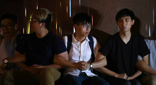 Joshua Wong (giữa) biểu tình ở tượng Golden Bauhinia ngày 28/6. Ảnh: AFP