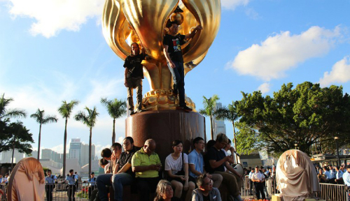 Người biểu tình trèo lên tượng Golden Bauhinia. Ảnh: CNN
