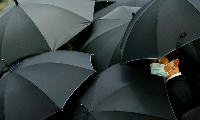 Một người đàn ông đeo khẩu trang để ngăn chặn virus SARS tham dự lễ tang của bác sĩ Tse Yuen-man ở Hong Kong, ngày 22/5/2003. Hong Kong là nơi bị ảnh hưởng nặng nề nhất của dịch SARS. Khoảng 299 người đã chết trước khi đại dịch SARS được công bố tại đặc khu này. Bác sĩ Tse đã mất vì SARS khi chăm sóc các bệnh nhân mang virus ở một bệnh viện. Cô được người dân Hong Kong xem như một người hùng.