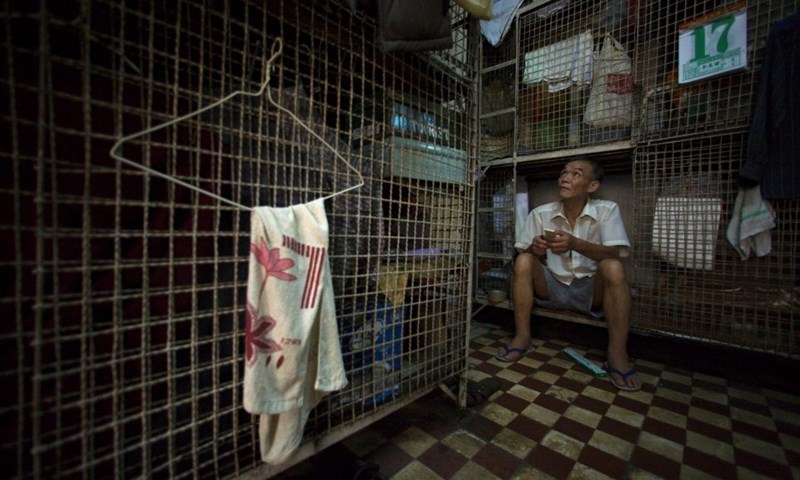 Người đàn ông có tên là Kong Siu-kau đang chờ đợi bữa tối trong một cái cũi nhỏ ở quân Tai Kok Tsui, Hong Kong, ngày 16/7/2008. Giá bất động sản tăng mạnh, đẩy giá thuê nhà cao khủng khiếp đã khiến hàng ngàn người dân Hong Kong phải chuyển đến ở trong những chiếc "nhà cũi" như thế này. Tới năm 2017, ước tính có khoảng 200.000 người Hong Kong vẫn phải sống trong những chiếc cũi nhà hay những ngôi nhà rộng chỉ bằng chiếc giường đơn.