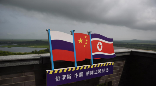 Cờ Nga - Trung Quốc - Triều Tiên trên một tháp canh ở khu giới tuyến phi quân sự ngăn cách Triều - Hàn - Ảnh: Getty Images