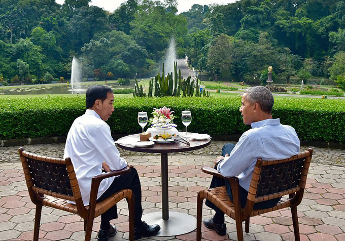 Ông Obama và Tổng thống Widodo ngồi ở một khu vườn ngoài trời hàn huyên và thưởng thức trái cây.