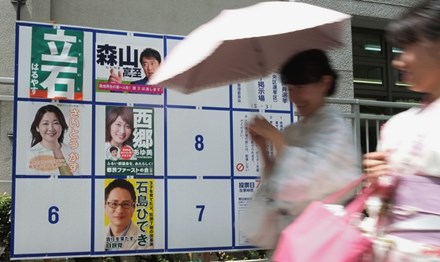 Một phụ nữ đi qua tấm bảng dán chân dung các ứng cử viên trong cuộc bầu cử quốc hội tại một điểm bỏ phiếu ở Tokyo ngày 2/7. Ảnh: Getty Images.