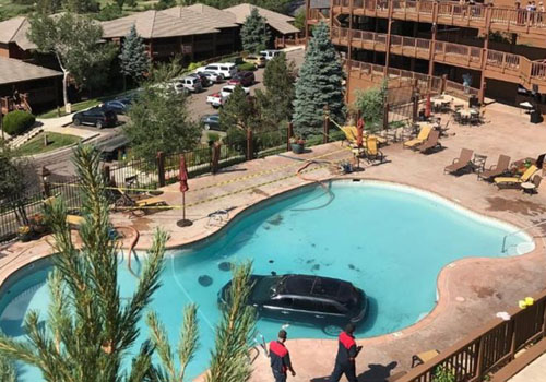 Một bà cụ hơn 70 tuổi đã nhầm lẫn giữa chân ga và chân phanh nên phi thẳng xe xuống bể bơi ngoài trời tại một khu nghỉ dưỡng ở bang Colorado, Mỹ, hôm 3/7