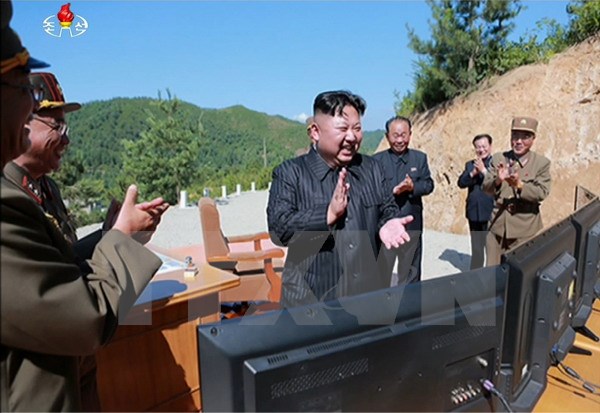 Nhà lãnh đạo Triều Tiên Kim Jong-un (giữa) theo dõi vụ thử tên lửa đạn đạo liên lục địa Hwasong-14 tại một địa điểm bí mật ngày 4/7.