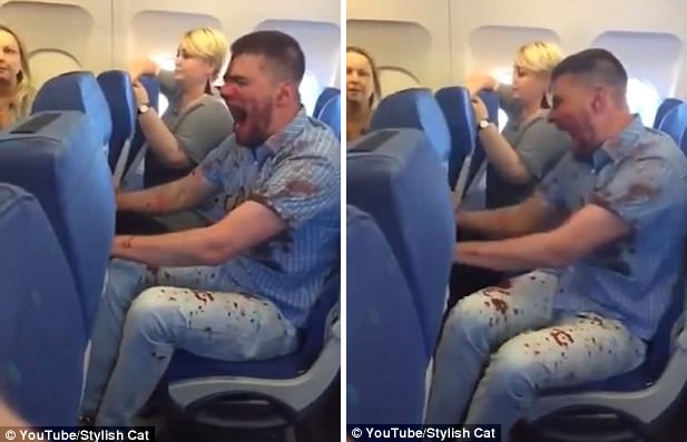 Theo đoạn clip do một hành khách trên chuyến bay ghi lại, người đàn ông say rượu đang ra sức la hét, đấm đá vào ghế phía trước mặc cho máu cháy đầm đ́a khắp mặt và rớt xuống quần áo.