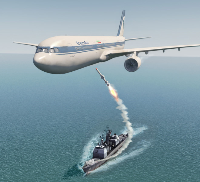 Hạm trưởng William C. Rogers III cho rằng chiếc A-300 đang bay là “một mối đe dọa” nên đã ra lệnh phóng 2 tên lửa đối không SM-2MR về phía chiếc phi cơ này. Tuy nhiên, dữ liệu từ hệ thống chiến đấu Aegis cho thấy chiếc A-300 đang lấy độ cao để bay lên chứ không giảm dần độ cao, điển hình của một cuộc tấn công từ trên không.