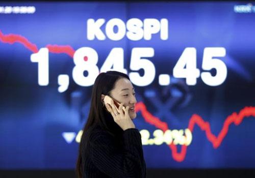 Một phụ nữ nói chuyện điện thoại trước tấm biển điện tử chạy chỉ số chứng khoán KOSPI ở Sở chứng khoán Hàn Quốc tại thủ đô Seoul ngày 21/1/2016. Ảnh: Reuters.