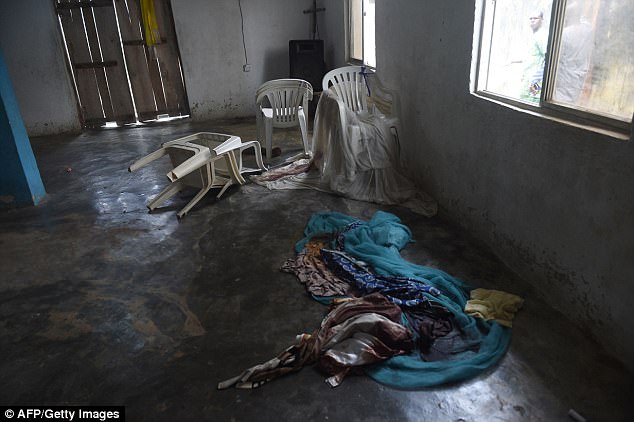 Người dân che mũi khi đi qua nhà thờ Thiên Chúa Crystal ở Owode Onirin, Nigeria, nơi vết máu vẫn còn trên sàn mùi xác chết vẫn còn ám ảnh.