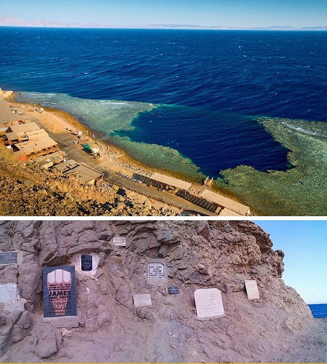 Được coi là "nghĩa địa của thợ lặn", hồ Blue Hole có thể là nơi nguy hiểm nhất để lặn trên thế giới khi rất nhiều thợ lặn đã phải bỏ mạng trong hồ nước sâu đến 119m này. Nguyên nhân gây tử vong là do bị nhiễm độc khí ni-tơ sâu dưới đáy hồ hoặc đôi khi bởi bình lặn không đủ dung tích khí dự trữ.