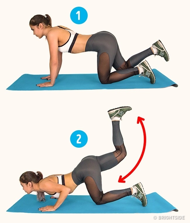 - Từ từ đẩy chân phải lại phía sau cho tới khi chân thẳng rồi lại trở về vị trí chân gập, cứ lặp đi lặp lại như vậy 8 lần sau đó đổi bên.