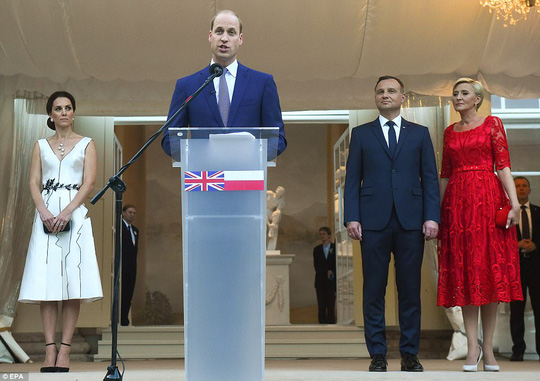 Hoàng tử William phát biểu tại bữa tiệc, kế bên là Tổng thống Ba Lan