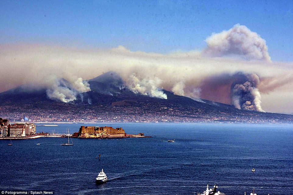 Núi lửa Vesuvius hiện không hoạt động, nhưng khói và cháy rừng xuanh quanh, khiến nhiều người nghĩ rằng nó đang phun trào dung nham và tro bụi lên bầu trời.