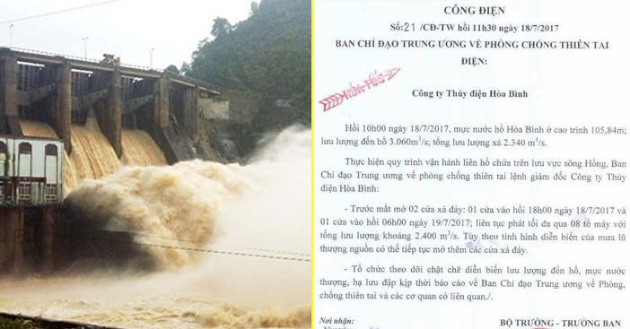 Theo quy trình vận hành liên hồ chứa trên lưu vực sông Hồng, Ban chỉ đạo Trung ương về Phòng chống thiên tai lệnh: Giám đốc Công ty thủy điện Hòa Bình mở 2 cửa xả đáy ở hồ thủy điện Hòa Bình.