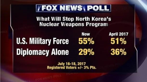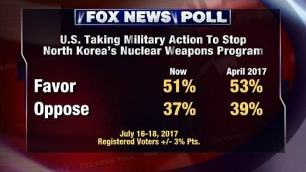 Khảo sát cho thấy 55% số người được hỏi cho biết cần phải dùng đến lực lượng quân sự của Mỹ để ngăn chương trình vũ khí hạt nhân của Triều Tiên, cao hơn con số 51% trong cuộc khảo sát hồi tháng 4. Kể từ thời điểm đó đến nay, Triều Tiên đã thực hiện một số cuộc thử nghiệm tên lửa và hạt nhân, trong đó có một vụ phóng tên lửa đạn đạo liên lục địa thành công vào ngày quốc khánh Mỹ (4/7).