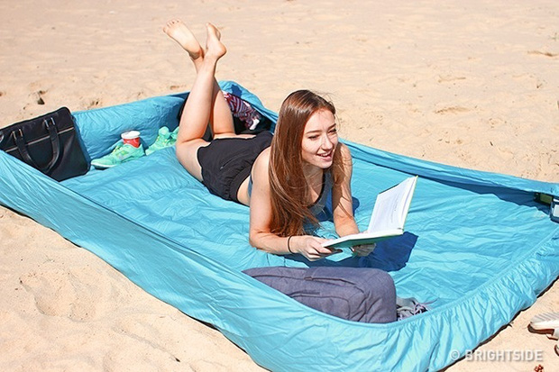 Để gió không thổi bay cát vào trong giày dép, quần áo và túi xách của bạn, hãy lấy ga trải giường ra để thay cho một tấm đệm nằm. Sau đó, dùng đồ đạc để chặn 4 góc của ga lại là bạn đã có ngay một "cơ ngơi" tắm nắng tuyệt vời.