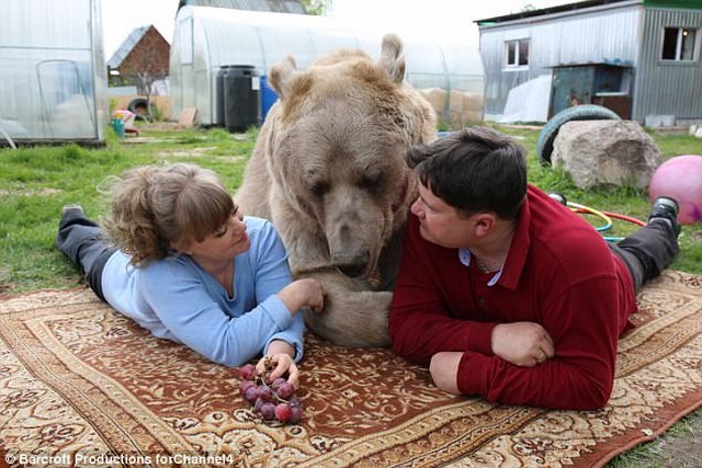 Stepan rất thích ôm chủ trên ghế sofa. Anh Yuri nói: “Stepan đã 24 tuổi rồi. Nó ở cùng chúng tôi khi còn bé tí. Chúng tôi nhận nuôi nó từ vườn thú khi mới 3 tháng tuổi và nuôi nó từ đấy tới giờ”. Yuri cho biết với loài động vật hoang dã như gấu nâu, cho ăn đầy đủ là rất quan trọng. Nếu không, hậu quả xấu có thể xảy ra bất kì lúc nào.
