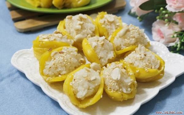 Khi xôi đã chín thì để xôi nguội sau đó bạn lấy thìa xúc từng ít xôi cho vào trong múi mít, rắc muối mè lên trên, nếu có dừa bào sợi thì rắc lên cho thêm phần hấp dẫn và thưởng thức.