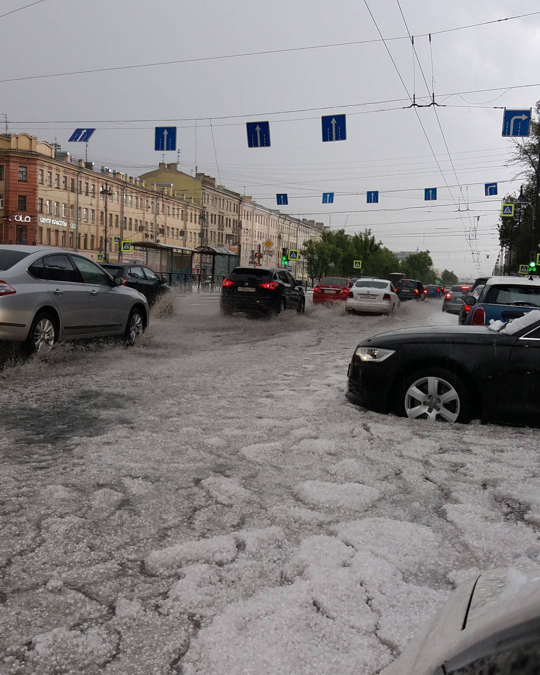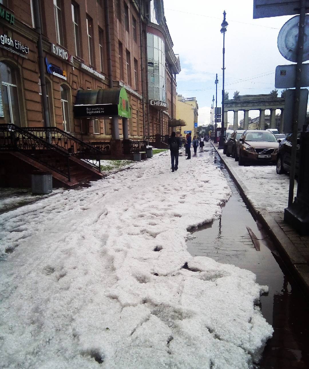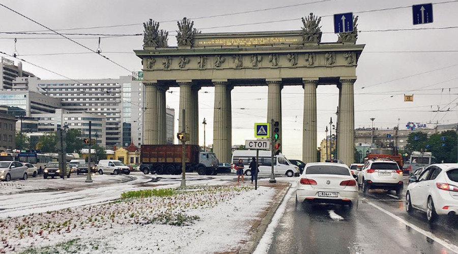Theo tờ RT, sau một trận mưa đá, nhiều tuyến đường trên thành phố St.Petersburg, Nga phủ một màu trắng giống như dòng sông băng giữa mùa hè.