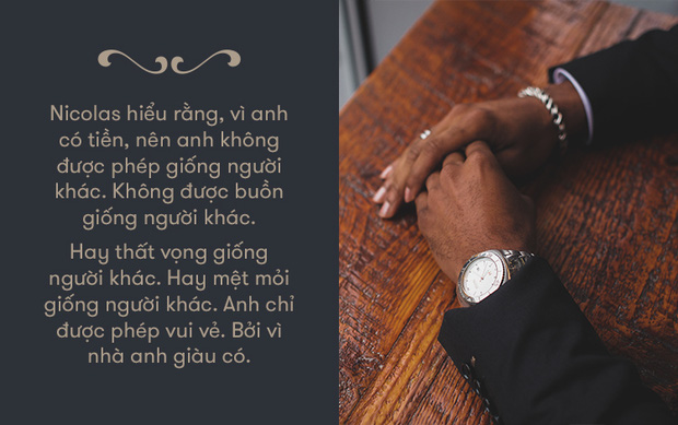 "Nằm trong top 1%, tức là 99% còn lại không hiểu về bạn, về gia đình, về vấn đề bạn gặp phải, về nỗi khổ thường trực của hội "vượt sướng". Bạn không được phép buồn bã. Chỉ vì gia đình của bạn có tiền" - đó là những gì Nicolas chia sẻ trên Quora.