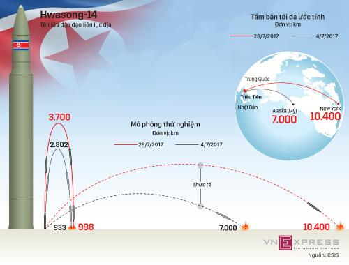 Tên lửa Hwasong-14 hôm 28/7 bay xa 998 km và đạt độ cao 3.700 km trước khi rơi xuống biển Nhật Bản. Với quỹ đạo bay này, quả đạn có thể đạt tầm bắn thực tế tới 10.400 km nếu được phóng ở góc chuẩn 45 độ, đặt toàn bộ lãnh thổ Mỹ trong tầm ngắm.